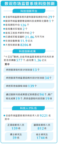 科技创新成果不断涌现。“十三五”期间,全省市场监管系统技术机构共承担各类课题577个,总经费1.36亿元。其中承担国家级科技计划项目13个;承担国家市场监管总局科技计划项目34个;承担其他省部级项目139个。通过国家科技成果登记系统登记94个,推广转化成果19个。荣获省部级科技奖励19项,荣获地市级科技奖励284项。申报获批各类发明专利1219项,主持制定各类标准、规程规范458项,发表各类学术论文2356篇。
