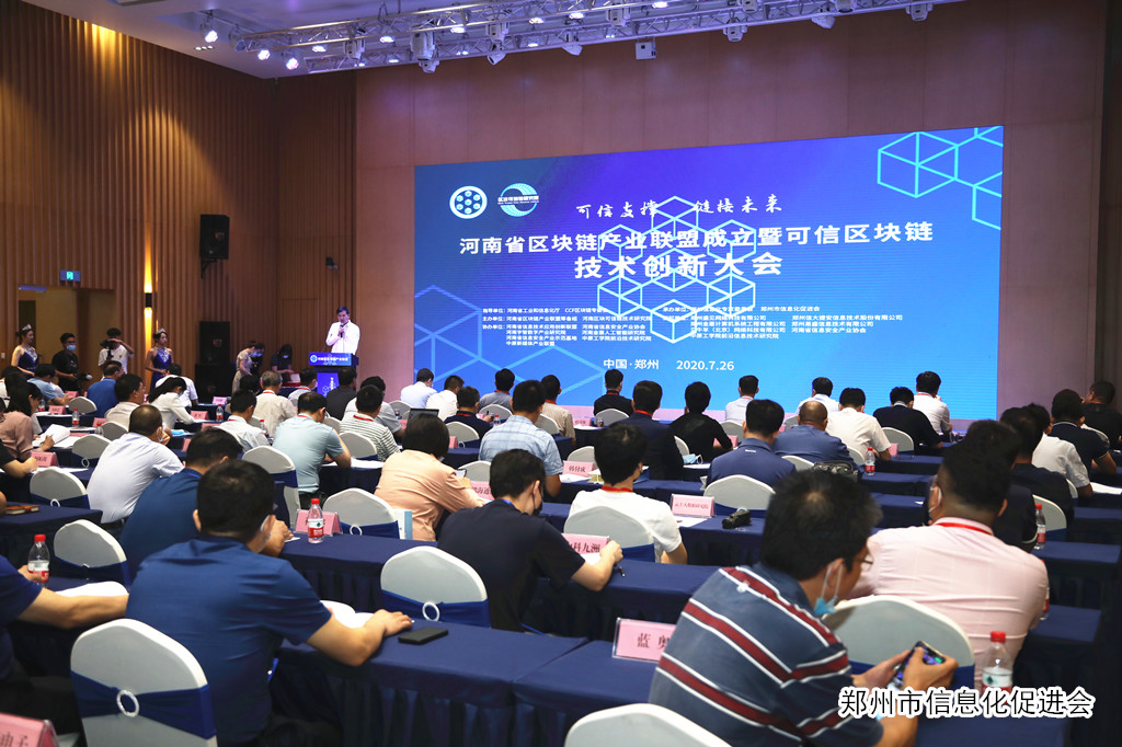 2020年7月26日上午,河南省区块链产业联盟成立暨可信区块链技术创新大会在楷林中心举行。省网信办、省工信厅、市人社局、市科技局、市工信局、经开区、金水区、航空港区领导,河南农业大学、河南工业大学、中原工学院等高校领导以及省内外10余所高校30位区块链专家、联盟首批110家成员单位共400余人参加了大会。全体参会人员共同见证了可信区块链技术创新大会这场饕餮盛宴。